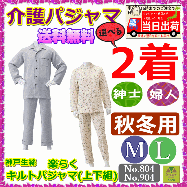 送料無料 楽らくパジャマ キルト 秋冬用 選べる2枚 紳士/婦人 No,804/No,904【介護用パジャマ 介護パジャマ 介護ねまき 介護寝巻 介護用ねまき 介護用寝巻 パジャマ ねまき 寝巻 上下セット 男性 女性 男 女 おじいちゃん おばあちゃん 入院 リハビリ 神戸生絲】